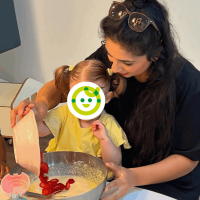 Die zuvor gewaschenen und geschnittenen Erdbeeren gemeinsam in den Teig geben – eine wunderbare Gelegenheit für die Kinder, ihre sensorischen Fähigkeiten zu stärken und beim Hantieren mit den frischen Früchten die Welt der Farben und Texturen zu erkunden.