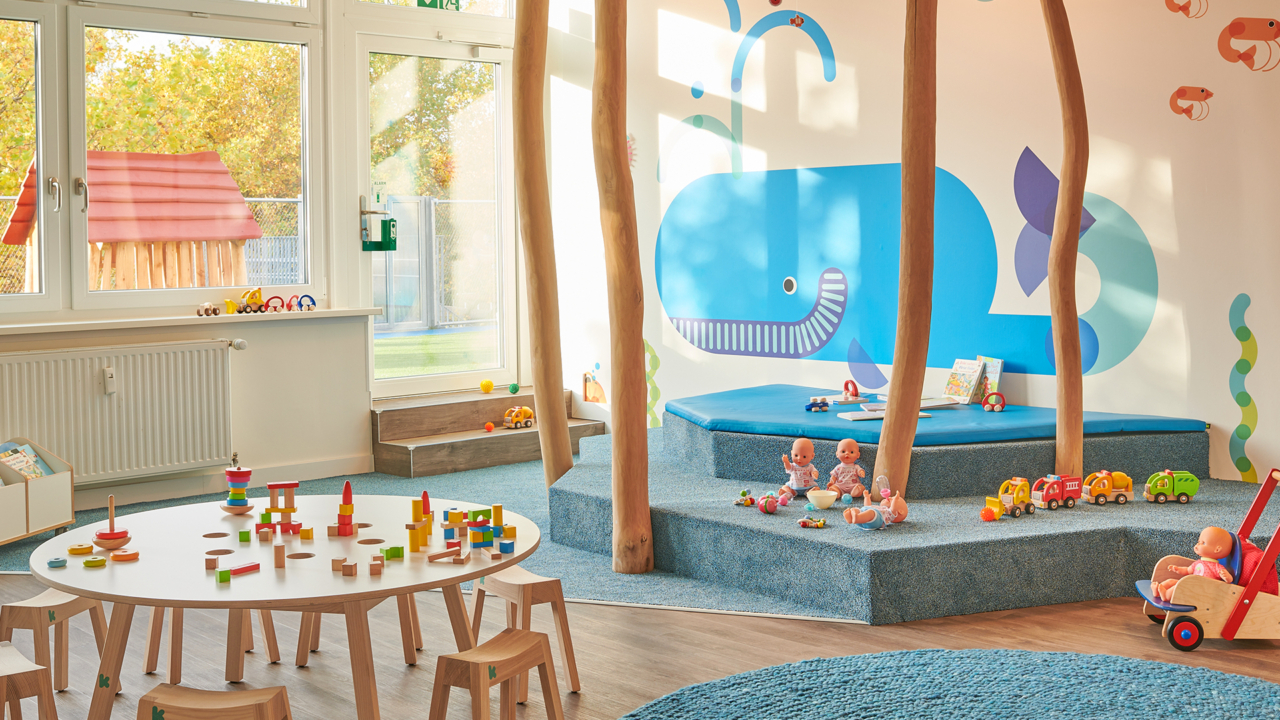 Wir leben ein Konzept, das Kindern Geborgenheit und Freiheit zugleich bietet. So schaffen wir einen Ort, an dem sie mit Freude wachsen können. Im Mittelpunkt stehen dabei die Bindung, Beteiligung und Bildung jedes einzelnen Kindes. Wir arbeiten situationsorientiert, das bedeutet, dass wir die Interessen und Bedürfnisse der Kinder ernst nehmen und daraus täglich neue Impulse und Angebote entwickeln. Dabei verbinden wir strukturierte Rituale mit freiem Spiel, kreativen Projekten, Bewegungsanreizen und gezielten Bildungsangeboten, beispielsweise in unserer alltagsintegrierten Vorschule oder in gruppenübergreifenden Stationen. Ein großer Fokus liegt auf der Beziehungsarbeit. Eine vertraute Bezugsperson, liebevolle Begleitung und ein sicherer Rahmen geben den Kindern Halt. Unsere offene Raumstruktur mit Schiebetüren, flexiblen Gruppenräumen und der Dachterrasse fördert Eigenständigkeit, Mitgestaltung und soziales Lernen.