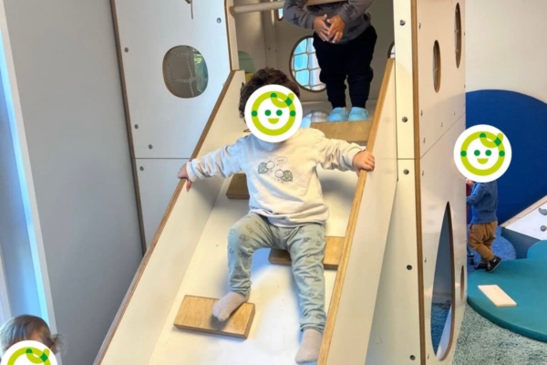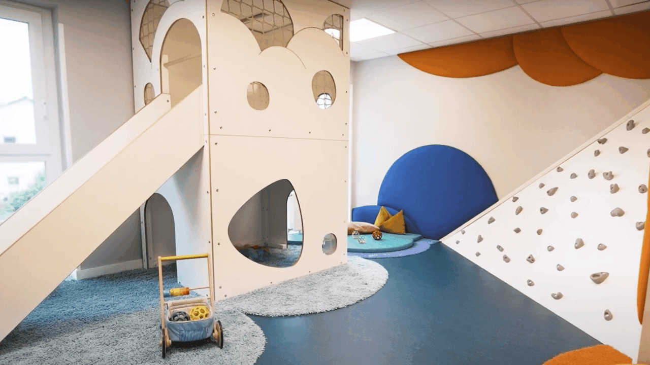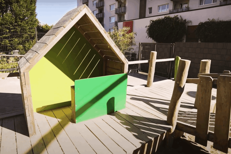 Unsere Elementargruppen haben im Untergeschoss viel Platz für Kreativität und Rollenspiele – von einem kleinen Einkaufsladen mit Kasse bis hin zu einer Kinderküche mit echtem Zubehör. Im Erdgeschoss befinden sich eine Krippengruppe, der Früh- und Spätdienst-Raum sowie die Küche und ein Wickelbereich. Eine weitere Krippengruppe hat ihren Platz im ersten Stock, direkt neben dem Schlafraum, dem Kinderrestaurant und unserem Bewegungsraum mit Kletterwand und Rutschturm. Draußen erwartet die Kinder unser großer Innenhof. Ein geschützter Spielplatz mit Schaukeln, Sandkasten und Fahrzeugen, die immer zu einem Wettrennen einladen.