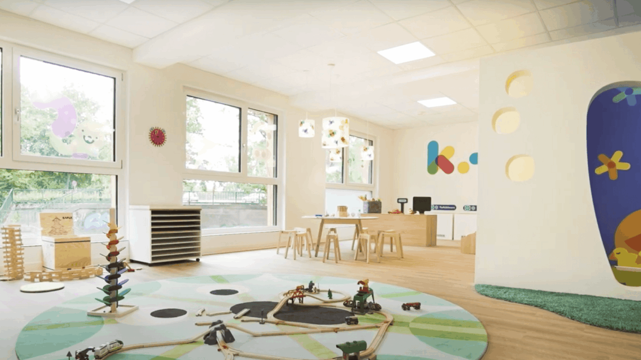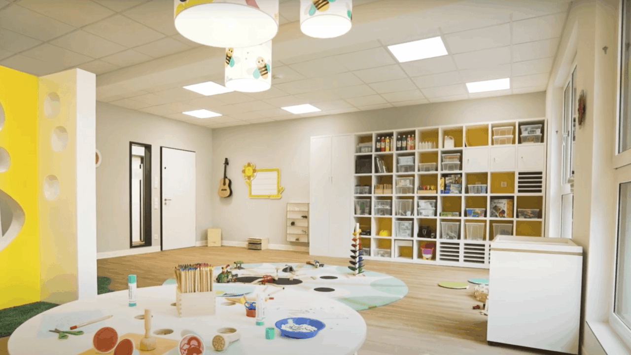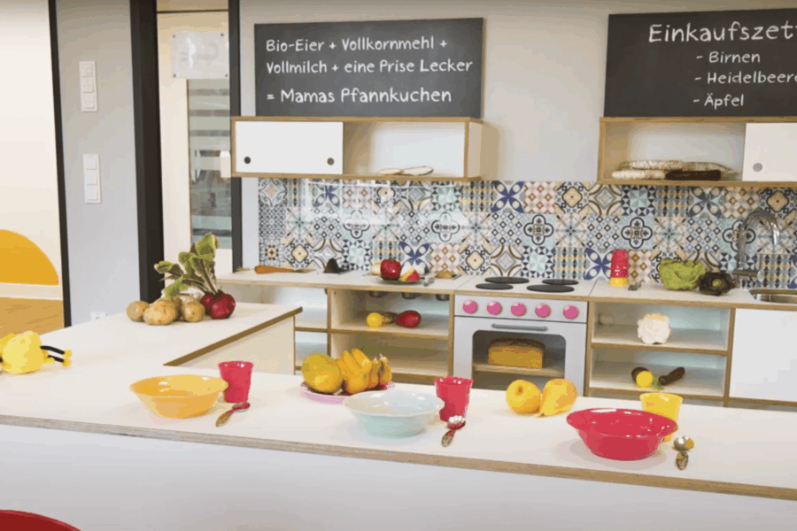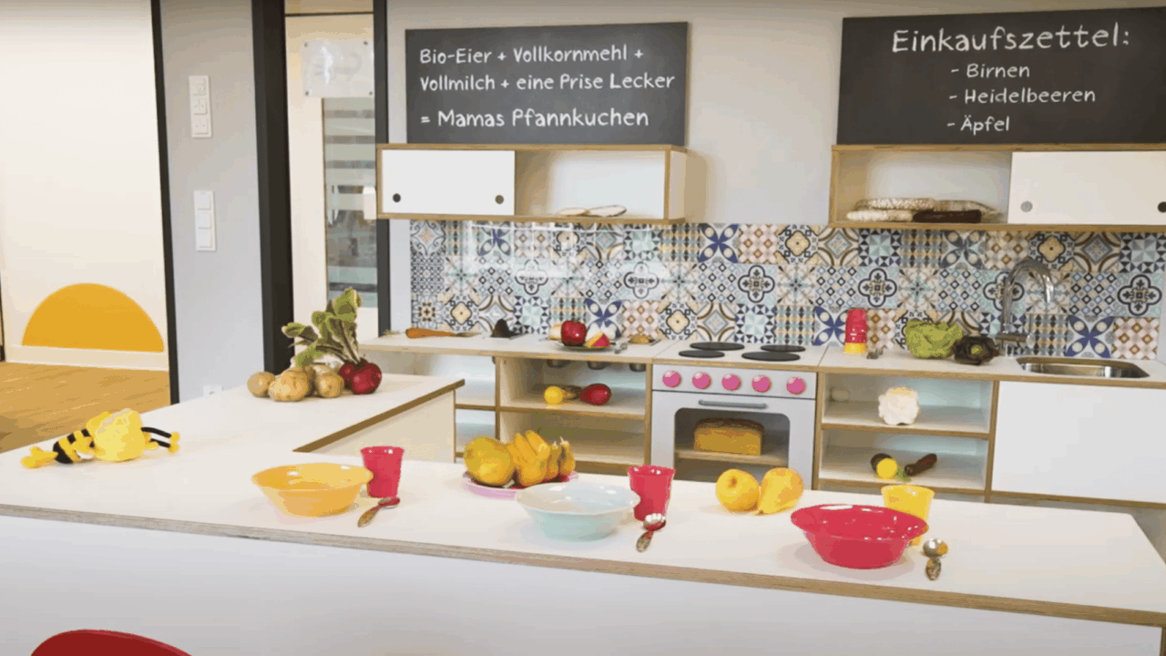 Bei uns im kinderzimmer Lehmberg finden Kinder eine anregende Umgebung zum Spielen und Entdecken. Unsere Räume sind kindgerecht, funktional und mit viel Liebe zum Detail eingerichtet. Ein besonderes Augenmerk liegt auf unserem Bewegungsraum im zweiten Stock. Dort können die Kinder an einer Kletterwand, einer Rutsche und einer Sprossenwand ihre motorischen Fähigkeiten entwickeln und sich austoben. In jeder Elementargruppe laden eine Spielküche oder ein Kaufmannsladen zu Rollenspielen und zum kreativen Miteinander ein. Diese Bereiche fördern die Fantasie und soziale Kompetenzen. Auch die Bedürfnisse der jüngsten Kinder in den Krippenräumen werden berücksichtigt. Musikinstrumente ermöglichen erste Klangerfahrungen, transparente Boxen mit Bildern erleichtern die Orientierung und gemütliche Ecken bieten Rückzugsmöglichkeiten. Hier wird jeder Tag besonders.