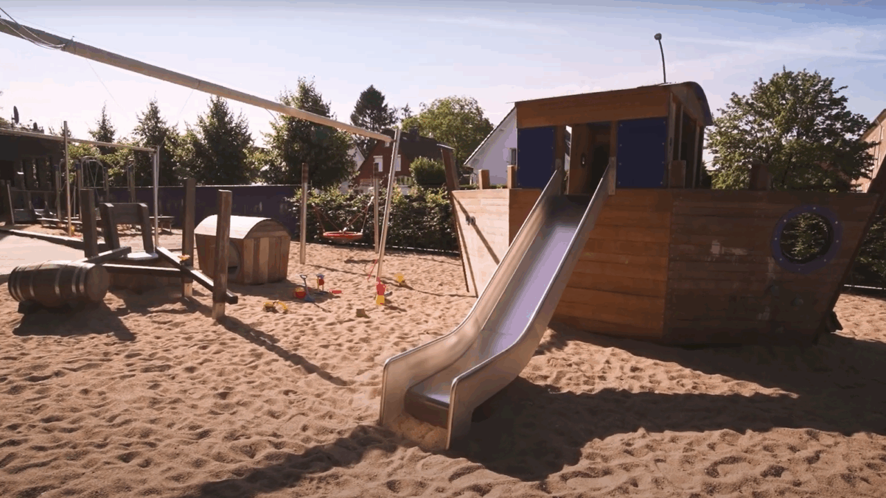Im kinderzimmer Rodelberg spielt das Leben nicht nur drinnen. Draußen sein gehört für uns zum Alltag – denn Bewegung an der frischen Luft stärkt den Körper, das Wohlbefinden und die Neugier auf die Welt. Unser großzügiges Außengelände lädt die Kinder täglich dazu ein, sich zu bewegen, zu entdecken und die Natur hautnah zu erleben. Insgesamt stehen zwei unterschiedlich gestaltete Außenbereiche zur Verfügung, die auf die Bedürfnisse verschiedener Altersgruppen abgestimmt sind. Für unsere Kleinsten gibt es geschützte Bereiche mit kleinen Rutschen, Kletterelementen und viel Platz zum Buddeln im großen Sandkasten. Die älteren Kinder können sich auf einem großen Spielschiff austoben oder spannende Rollenspiele im Freien erfinden. Tische und schattige Ecken bieten Raum für kreative Angebote unter freiem Himmel. Das große Sonnensegel sorgt im Sommer für angenehmen Schatten, sodass das Spielen auch an heißen Tagen unbeschwert möglich ist. Ebenso toll ist, dass durch die direkte Anbindung der Gruppenräume ans Außengelände, die Kinder flexibel rausgehen können – oft schon am Vormittag und fast immer am Nachmittag, bei jedem Wetter.