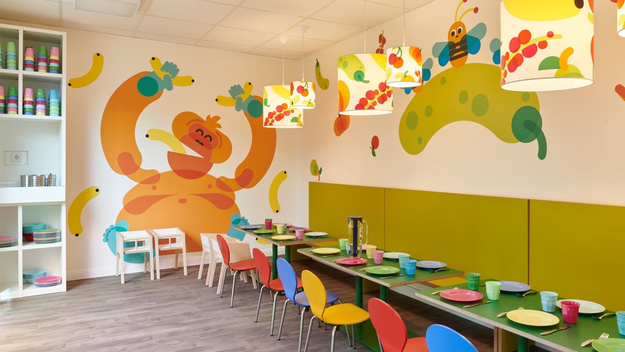 Nach einem frischen und abwechslungsreichen Mittagessen, das ab 11 Uhr ansteht, beginnt die Ruhezeit. Während die Krippenkinder für ungefähr 1,5 Stunden schlafen, gehen die Elementarkinder Zähne putzen und nehmen danach am Mittagskreis teil, in dem sie den Vormittag reflektieren oder ruhige Spiele spielen.