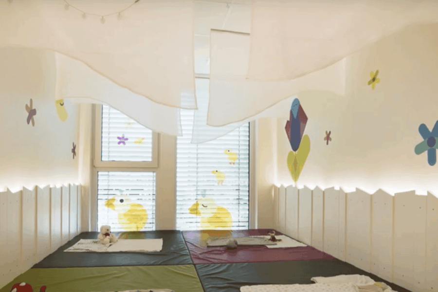 Als erstes wird aus der eigenen Schlafbox der Schlafsack herausgeholt und dann am Lieblingsort platziert. Um den Kindern das Einschlafen zu erleichtern, wird leise Musik gespielt, die eine beruhigende Atmosphäre schafft. Manche Kinder schlafen schnell ein, andere brauchen noch etwas Nähe. Während die Krippenkinder etwa 1,5 Stunden schlafen oder ruhen, haben die älteren Kinder im Elementarbereich eine alternative Ruhezeit. Im Mittagskreis reflektieren sie den Vormittag, spielen dann ruhige Spiele, hören eine Geschichte oder ziehen sich in die Käseecke zurück, um sich eine Pause zu gönnen.
