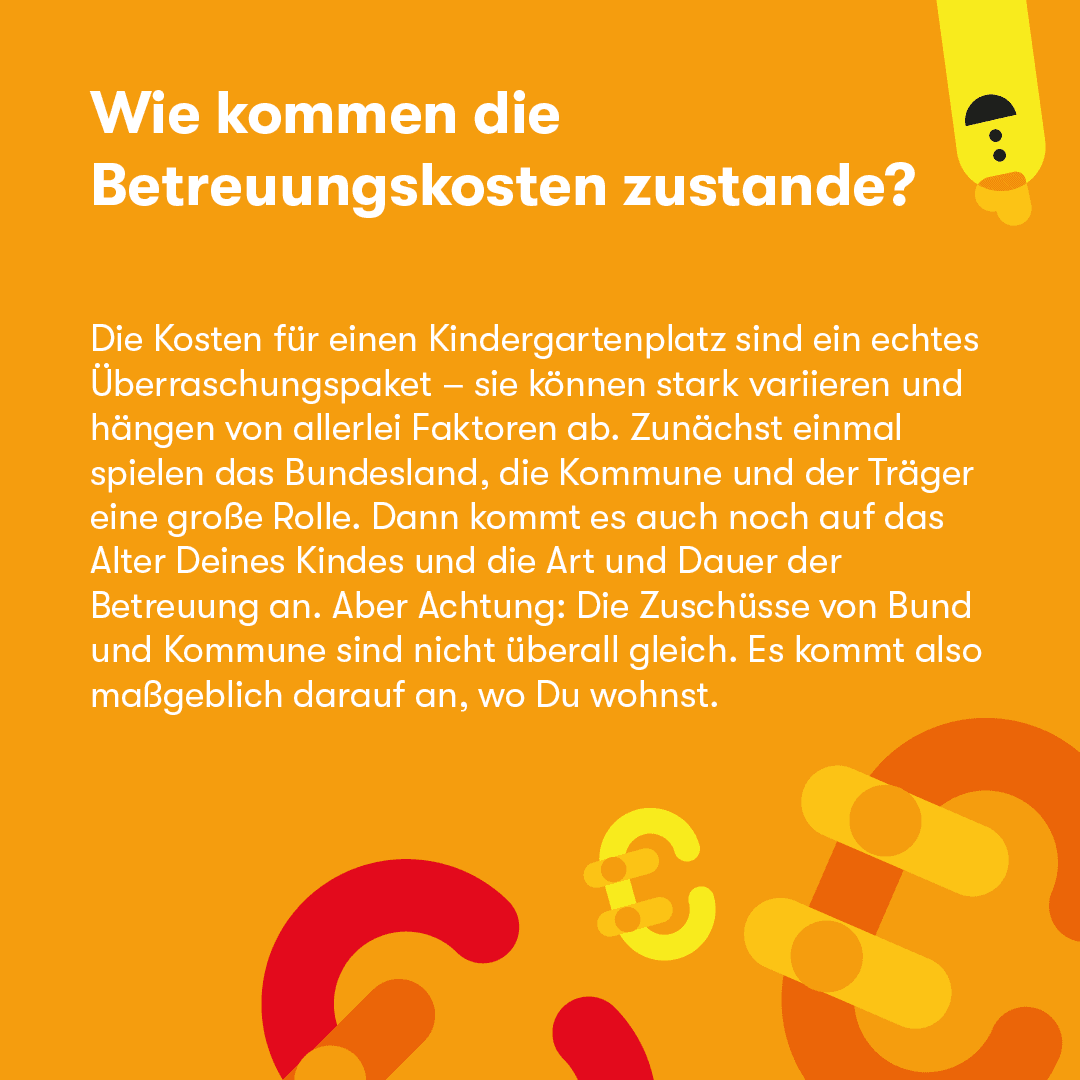 Hier erfahren Sie, wie sich die Kosten für die Kita zusammensetzen und welche Finanzierungsmöglichkeiten es gibt. Und Sie können den Beitrag für Ihre Familienkonstellation direkt ausrechnen lassen.