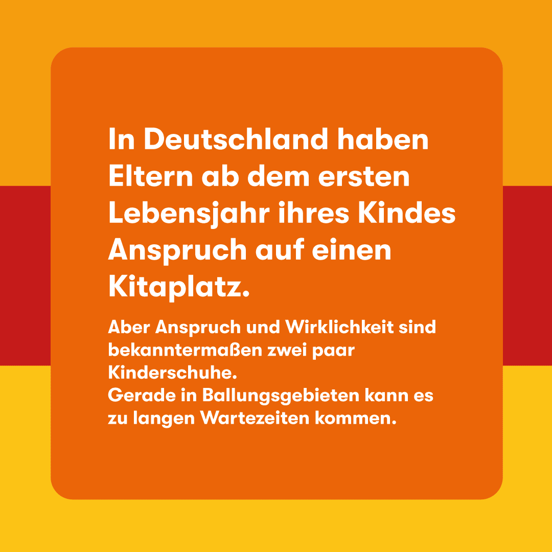 In Deutschland haben Eltern ab dem ersten Lebensjahr ihres Kindes Anspruch auf einen Kitaplatz. Aber Anspruch und Wirklichkeit sind bekanntermaßen zwei paar Kinderschuhe. Gerade in Ballungsgebieten kann es zu langen Wartezeiten kommen.